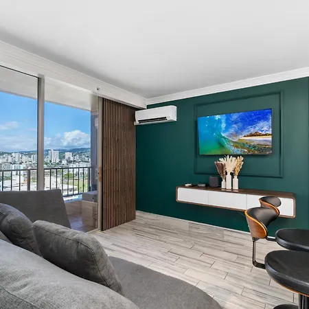 Die 32 m² großen Modern Suite Free Parking View AC King Bed Kitchen Honolulu bietet einen beheizten Swimmingpool und eine Terrasse. Es befindet sich im Stadtviertel Waikiki von Honolulu, 13 Gehminuten vom Waikiki Beach entfernt. In diesem Apartment, das 300 Meter vom Upscale shopping liegt, finden die Gäste die Sauna.